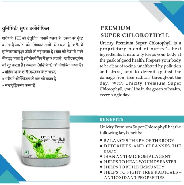 Unicity Premium Super Chlorophyll is a plant-based product containing the potent form of one of nature’s most powerful nutrients – Chlorophyll. It naturally helps to keep your body at the peak of good health, prepares your body to be clear of toxins, unaffected by pollution and stress, and to defend against the damage from free radicals throughout the day. Regular use of Unicity Premium Super Chlorophyll supports the human body to enhance energy levels and amplify the state of general well-being.